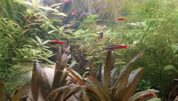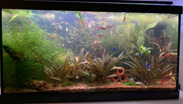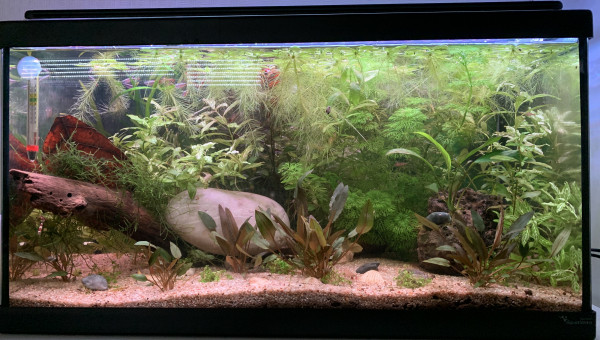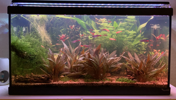 Début plutôt simple avec l'introduction des crevettes qui se plaisent bien. L'introduction des premiers poissons fût plus difficile (c'est mon premier aquarium) avec quelques pertes et un très gros changement d'eau pour venir vers des paramètres de GH/KH plus acceptable. Une seconde expérience plutôt compliqué avec l'éclosion d'oeufs d'artémias, mais je pense que je m'y suis mal pris pour récolté les nauplies d'artémias et j'ai eu des décés suite à ça. Du coup j'ai mis ce mode de nourrissage de côté pour le moment. Nourriture sèche éxclusivement pour les poissons pour le moment et le fraîche, pochée, de temps en temps pour les crevettes.