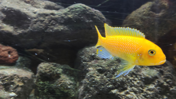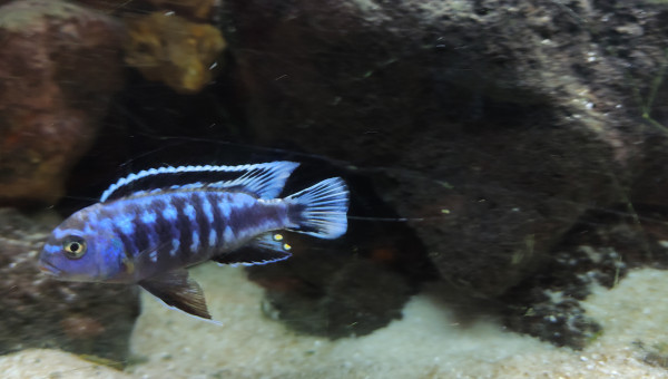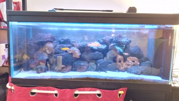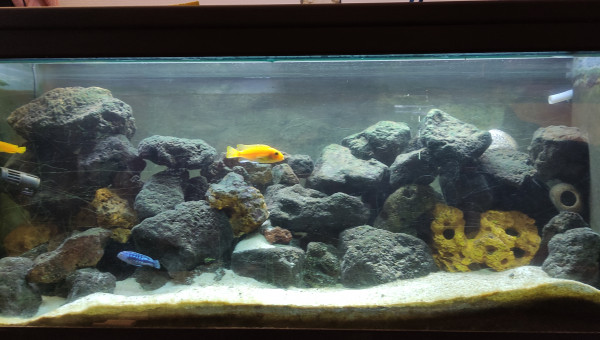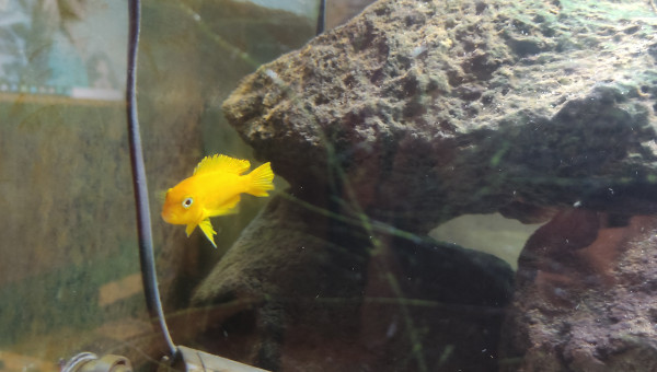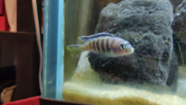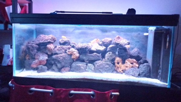 Mûr de roche centrale et fond sablonneux Filtre à décantation interne pompe 1200l/h Population actuelle : 1/2 saulosi 1 femelle estrade