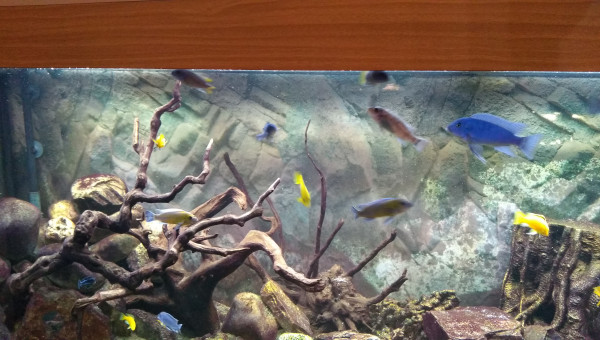Nettoyage vitres et changement ouate. Ajout iodotropheus sprengere 1/2 et une femelle labidochromis sp mbamba bay. Traitement: - 70 g buffer ph gh. -150 g sel.