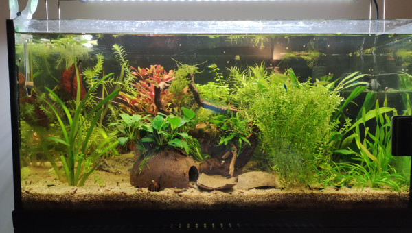 Bac contenant un banc de microdevario kubotai avec des neocaridinas blue velvet