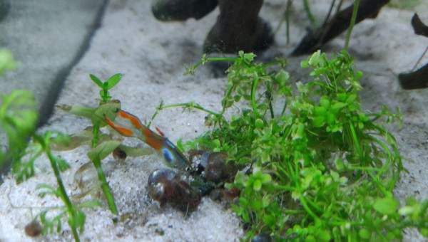 Aquarium trouvé dans la rue et remise en eau. Guppys endler mâle et crevettes neocaridina