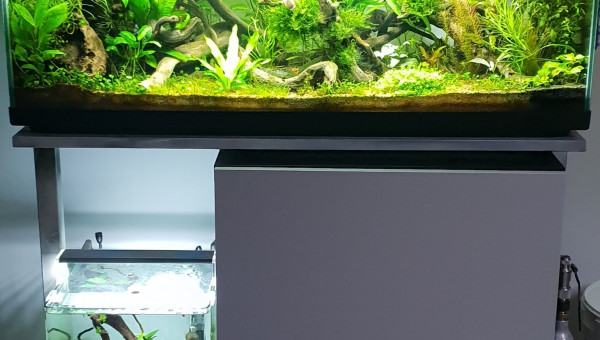 Aquarium biotope en eau douce. Volume brut d’environ 32 L (30×30×35 cm). Volume net : 30 L. Mis en eau le 10 janvier 2018. Propriétaire basé à Maubeuge.