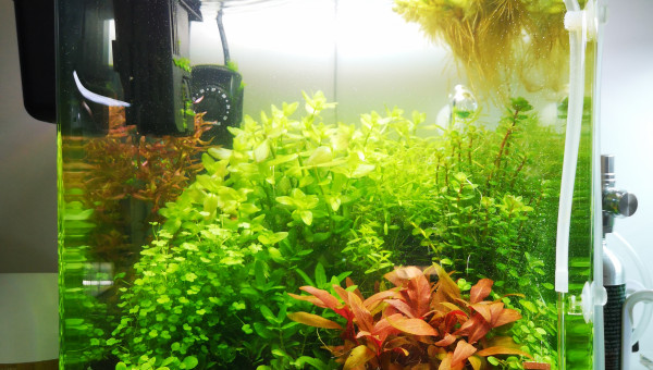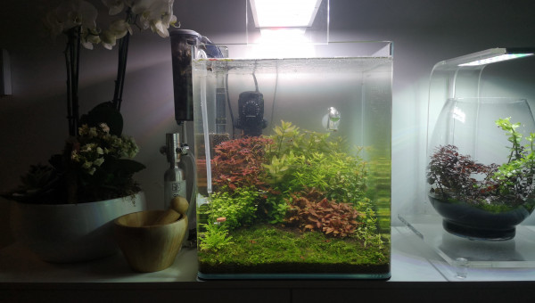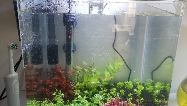 Ajout de buffer KH+ (0,2 dosette) : pH passé instantanément de 4 à 8 ! Changement d'eau dans la foulée. Ajout de Purigen au filtre : eau éclaircie rapidement