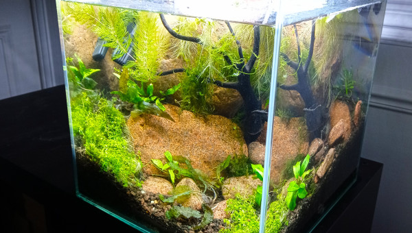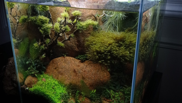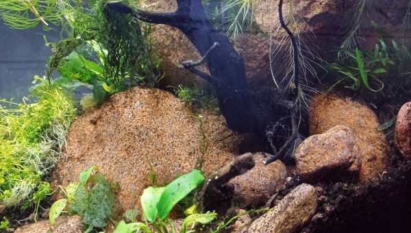 Riccardia recyclée en petit chêne liège. Fissidens implantée sur arbre de gauche. Fin expérience du buisson plagiomnium. Feuillage sympa mais pousse trop haut et se taille mal. Après algues filamenteuses (asséchées), cornes de cerf dans les mousses en plein dans le courant. Si c était simple ça serait pas drôle ;)
