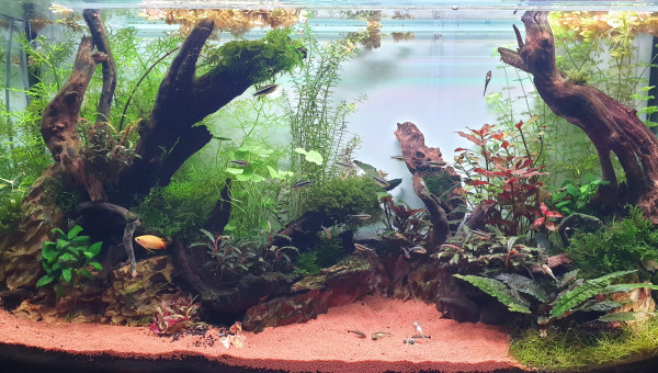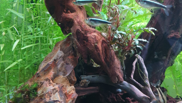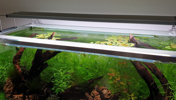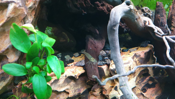 Apparition de traces d'algues (duvet) sur les feuilles des Anubias. Arrêt de l'engrais qui, même en petite quantité, déséquilibre le bac. A revoir plus tard.
