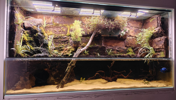 Paludarium avec une hauteur d'eau de 35cm. La partie aquatique vient d'etre completement refaite. Pour l'instant, il y a 30 cardinalis et 10 corydoras sterbai.