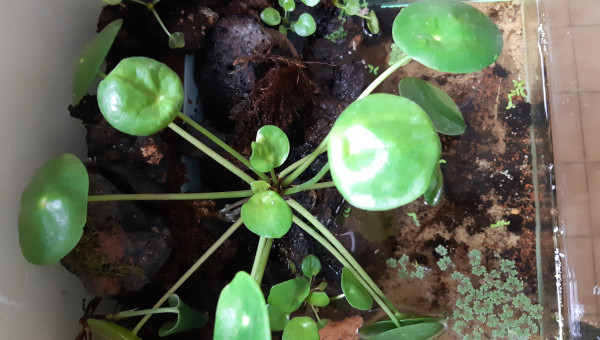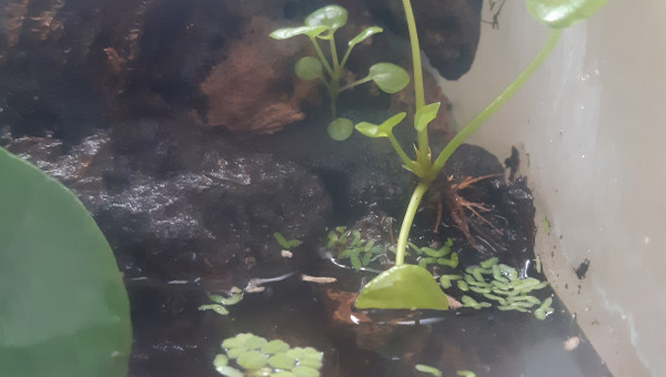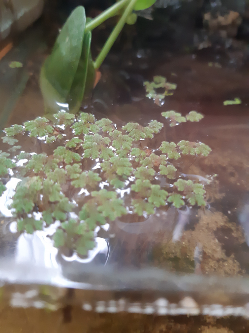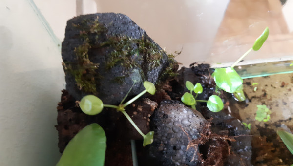 Petit paludarium 10 litres bruts (30×25×25) Support boîtes plastiques Roches volcaniques Plantes : mousse racomitrium, fontinalis antipyretica, pilea, flottantes diverses et 2 autres plantes Projet d'ajouter des bucephalandras.
