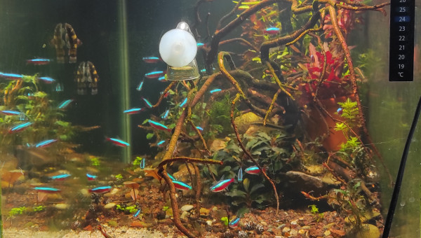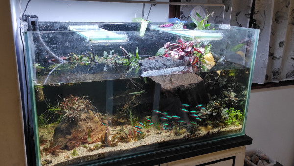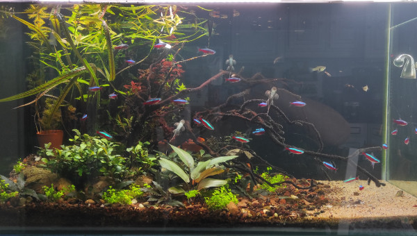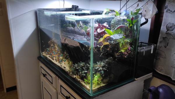 Rescape effectué il y a deux semaines de ce qui fut jadis un hollandais. Les plantes ont séjournés un peu trop longtemps dans un bac poubellarium d'intérieur non éclairé non chauffé et n'ont pas apprécié. Certaines de mes buces ont pris cher, mes stautogynes ont disparus. Maintenant la vie reprend tranquillement son chemin. La population demeurera inchangé si ce n'est un petit tétraodon nain rescapé (voir mon stand), deux jeunes crossocheilus oblongus qui vont rejoindre des copains dans le 600l du beau-frère, de guppys endler issus d'un "sauvetage" dont les alevins servent de repas de temps à autres et d'un couple d'apistogramas hongsloi à venir (commande en cours).
