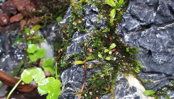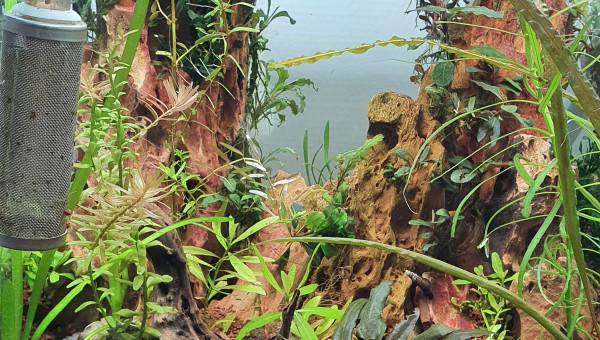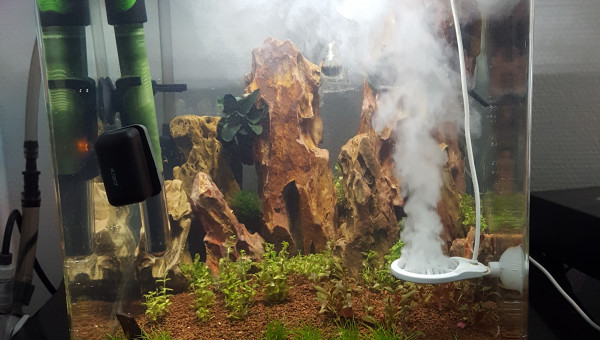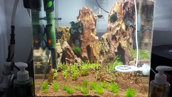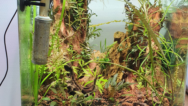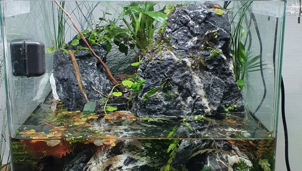 Aquascape de 30l realise dans un nano cube de Dennerle, surverse caché fabriquer maison pour eviter au animaux et substrat de passer dans la pompe, montage de grosse roches seyriu Stone entre autre afin de faire une belle cascade, projet en cours