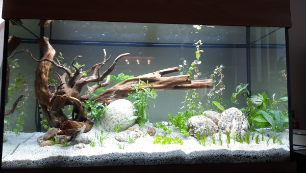 Après 2 mois, et l'introduction il y a 3 semaines de crevettes Amano et red cherry, j'introduis 10 microrasbora galaxy. Ils sont tous très vifs et semblent apprécier toutes les cachettes (racines, plantes, pierres). Encore peureux, filent se cacher lorsque l'on s'approche trop vite.