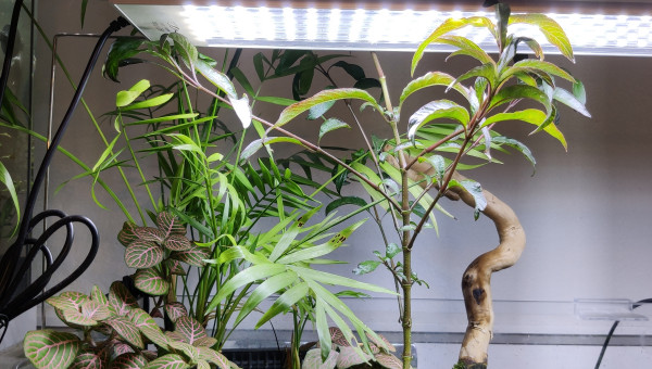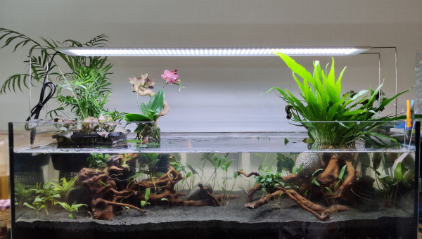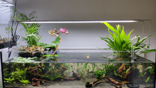 Emergées : Chamaedora elegans, Anubias barteri 'Coffefolia', Fittonia verschaffeltii, Microsorum pteropus, Anubias barteri 'Nana' ou Anubias 'Petite', Phalaenopsis (orchidée-papillon) Immergées : Hygrophila, Crinum calamistratum, Bolbitis heudelotii, Nymphoïdes peltata, Cryptocoryne wendtii ou beckettii, Echinodorus 'Ozelot'