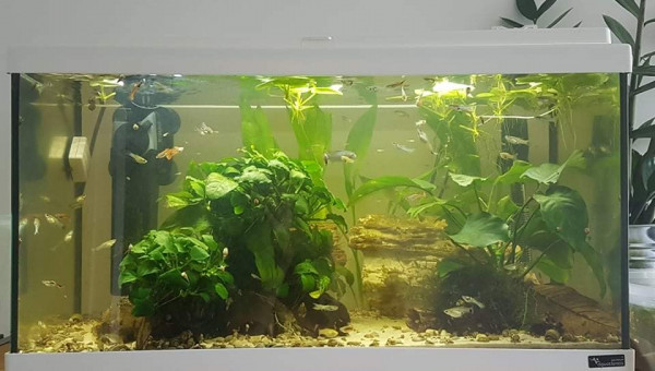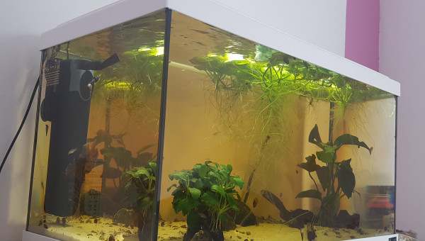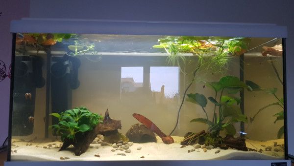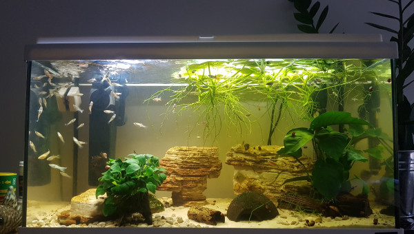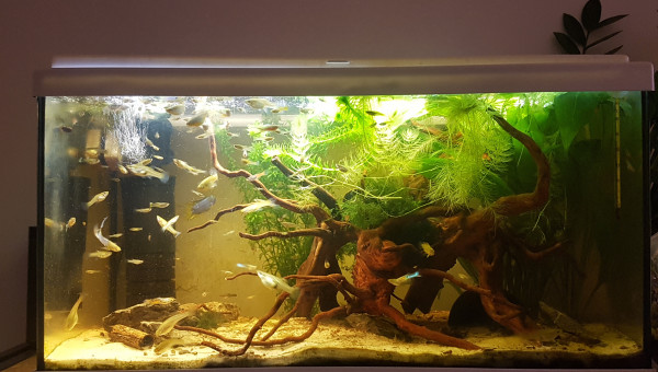 Depuis que tous les corydoras ont rejoins le 365... des alevins guppies endler tiger et blue japan ont investi les lieux... et hier, un trio d'alevins cyclidés arc-en-ciel (herotilapia multispinosa). Oui un 60L est trop petit pour eux, mais pour le moment ce sera suffisant. ;)
