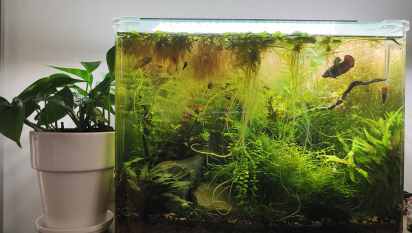 Marius transporté à Toulouse pour la durée du confinement, actuellement dans un 21 L avec exhausteur , cryptocorynes, Egeria densa, Hydrocotyle leucocephala, Salvinia natans, une demi coco et des feuilles de catappa.