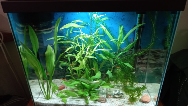 Aquarium 60 litres, eau douce avec fond sable Loire et plante. Il y à 10 tétras amendée, 3 guppys et 3 crevettes. Aquarium qui fonctionne depuis plus de 6 mois sans problèmes.