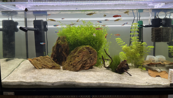 Bac vidé et nettoyer Mise en place hardscape Ajout filtre extérieur Récupération de 50 litres d’eau + 60 litres bac Aquael.