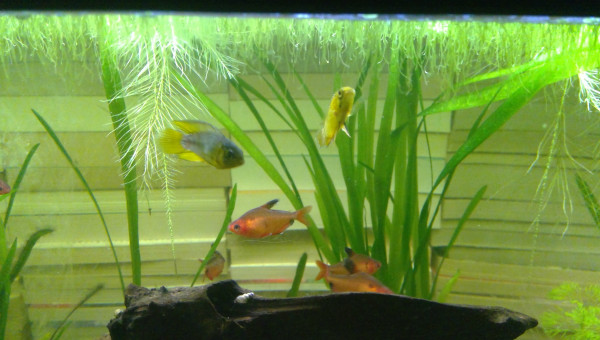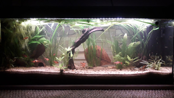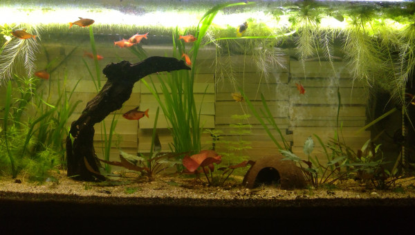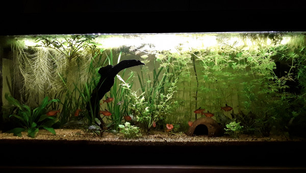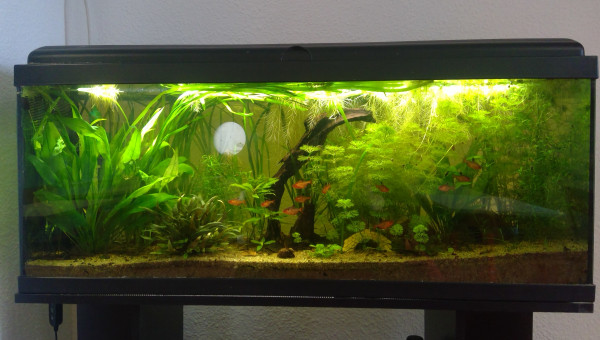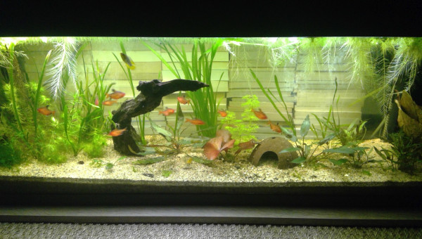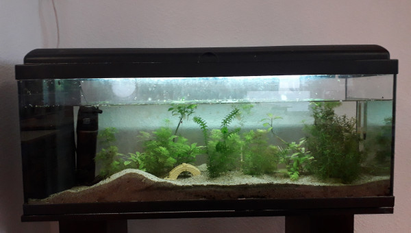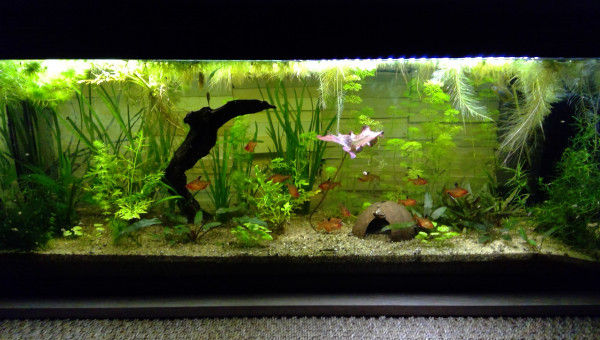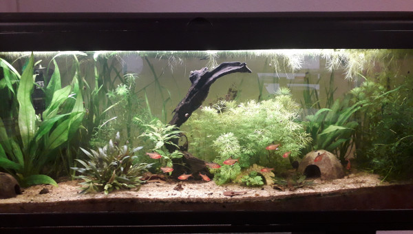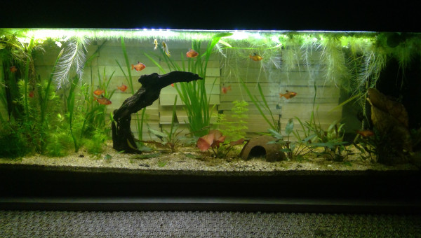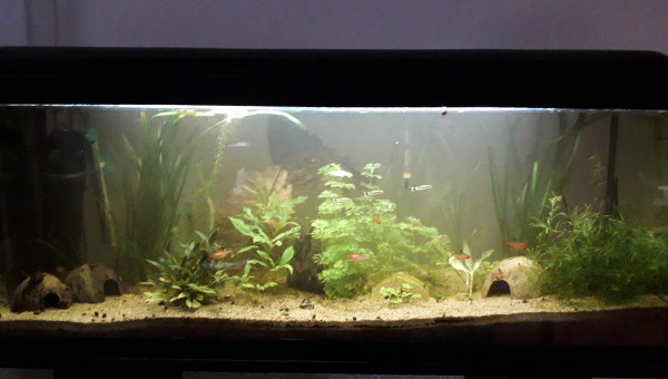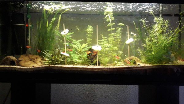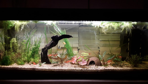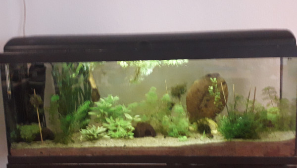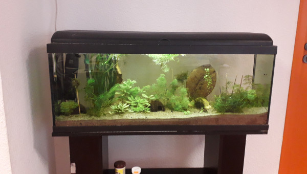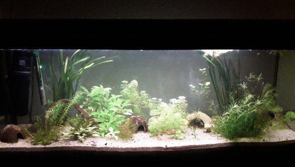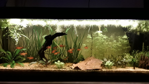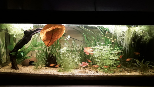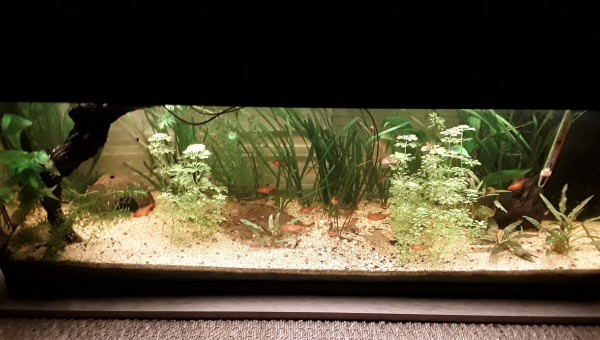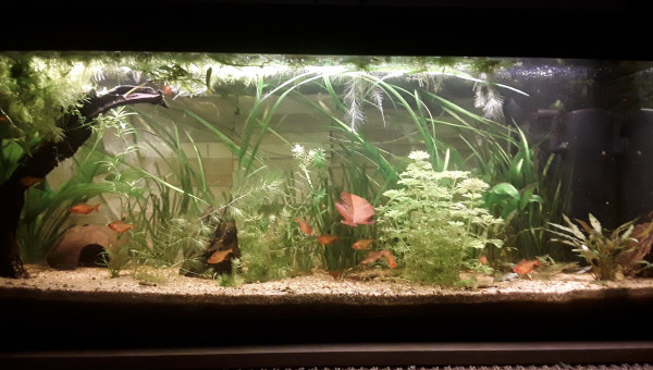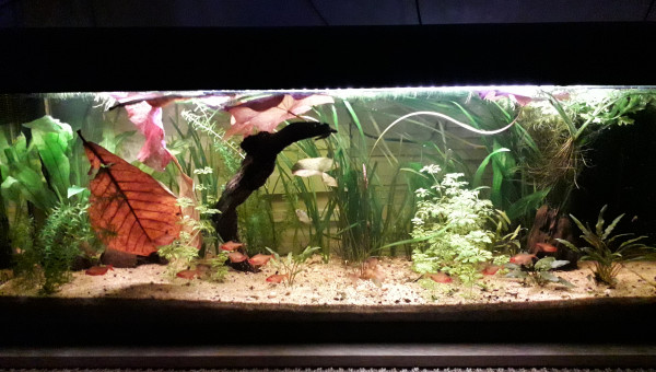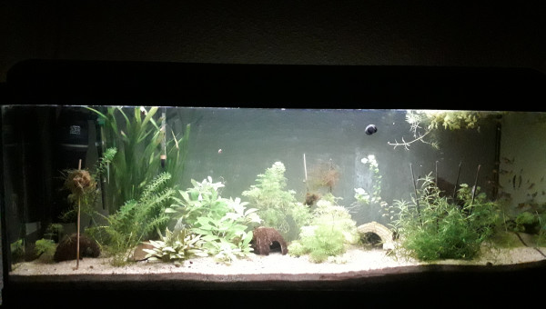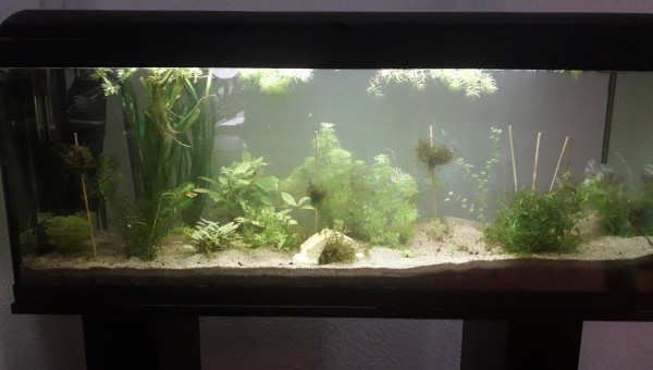 Le 120 L 3 semaines après le déménagement, les végétaux ont redémarré, le lotus qui a germé la semaine dernière fait deux belles feuilles, pourvu que ça dure ! Il y a juste l'hygrophila qui m'agace un peu, qu'est-ce qu'elle est fragile cette plante ! Elle casse pour un rien et elle fond au moindre changement...