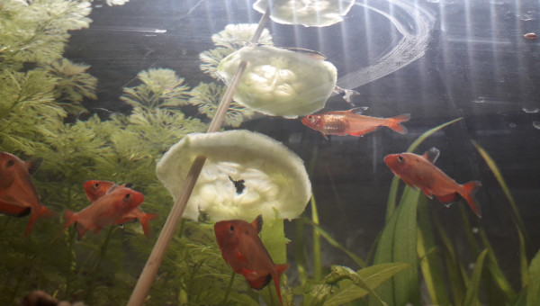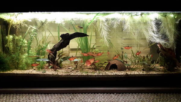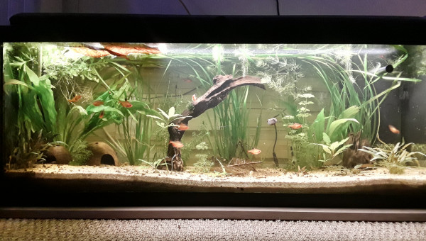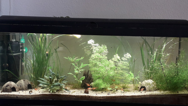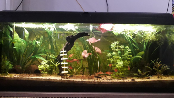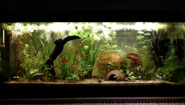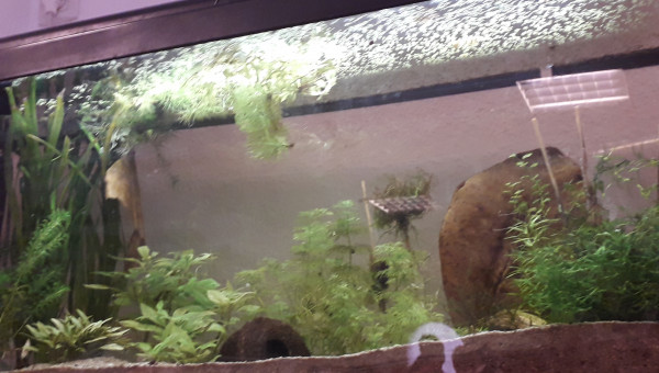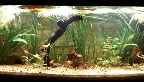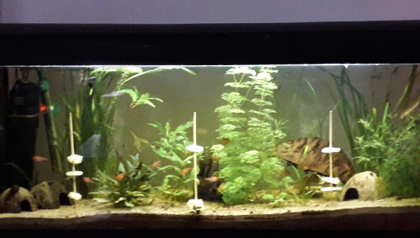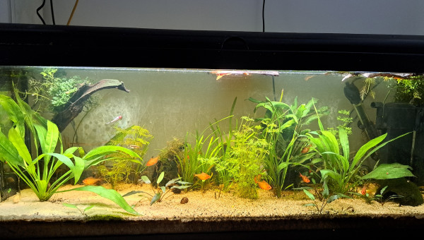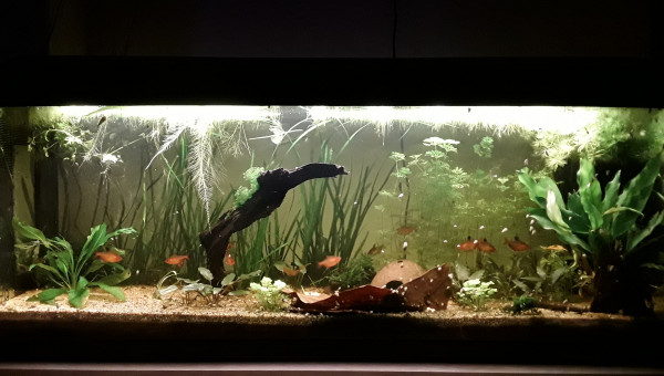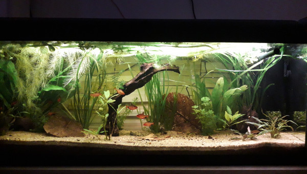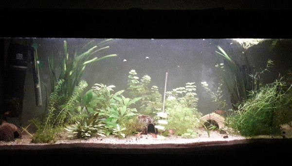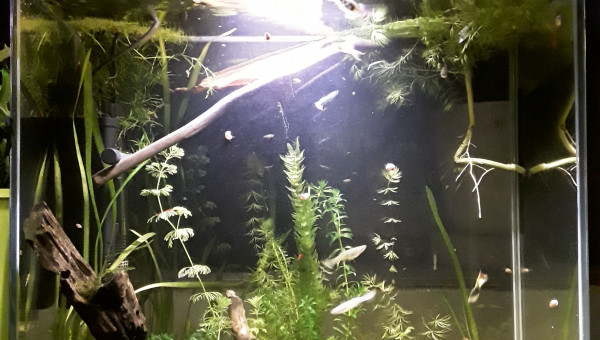 Premier repas post déménagement d'hier, tout le monde est là et visiblement en bonne santé, l'eau est de plus en plus claire, 2 filtres en même temps ça aide, et le changement de décor semble plaire aux serpae et aux borellii (dont je suis maintenant quasiment sûre que ce sont deux mâles ?), les neritinas se promènent, quant aux otocinclus, ils doivent trouver la végétation pauvre, j'en avais 3 fois plus, mais pas trop de place pour tout trimballer, y a eu des coupes drastiques... ça va repousser ? il y a encore du ménage à faire et 2 / 3 plantes à ajouter, mais ça va venir... par contre, des conseils pour mon bulbe de lotus zenkeri qui ne prend pas ? Il est là depuis novembre, il est semi-enterre, il est dur et lourd, ne sent pas mauvais, je sais pas pourquoi il ne prend pas...