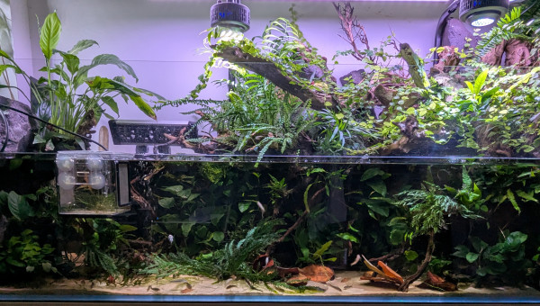 Bonjour à tous, Pas mal de changements sur ces dernières semaines ; les garras et les sewellias ont déménagé. Les garras sont partis dans un bac bien plus grand, ils étaient à l'étroit avec la hauteur de mon bac (35cm pour rappel) ça reste des poissons très nageurs et très très vifs. Ensuite, j'ai également trouvé une bonne famille pour les sewellias dans l'idée de dédier ce bac aux aspidoras. C'est un petit poisson absolument génial, ultra vif et vraiment fun à regarder. J'ai donc repensé le bac pour qu'il corresponde à leur besoin (racines, plus d'espace de nage, feuilles, branches, etc) et j'en ai profité pour tester quelques plantes en "riparium" pour voir ce que ça donne et dans l'objectif de tamiser la lumière qui atteint le bac pour faire comme une canopée. Ils se portent beaucoup mieux depuis qu'ils sont presque seuls (presque car ils partagent le bac avec 6 mâles endlers qui ne sont plus tout jeune, je vais certainement leur créer un bac de retraite) : beaucoup plus nageurs, ils mangent mieux également. Ils se reproduisent pas mal et je vois des jeunes apparaître petit à petit (environ 5 depuis la refonte du bac en septembre). J'ai vraiment hâte de découvrir leur comportement quand ils seront en plus grand nombre, ça va être la folie je pense.
