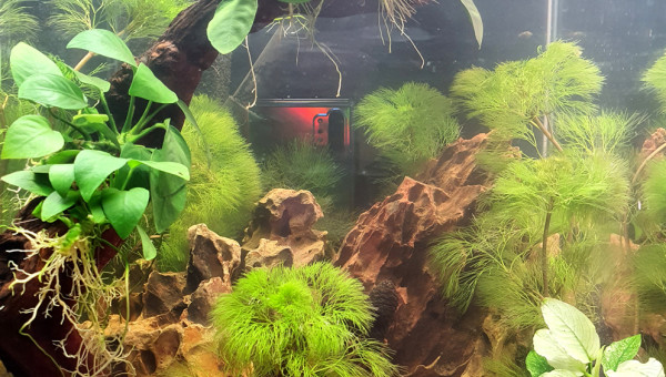 Nano monté en urgence avec le filtre d'un aquarium rodé, suite au sauvetage d'un Splendens trouvé sur un site de petites annonces.