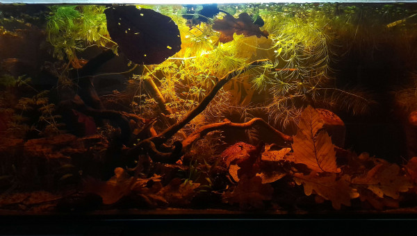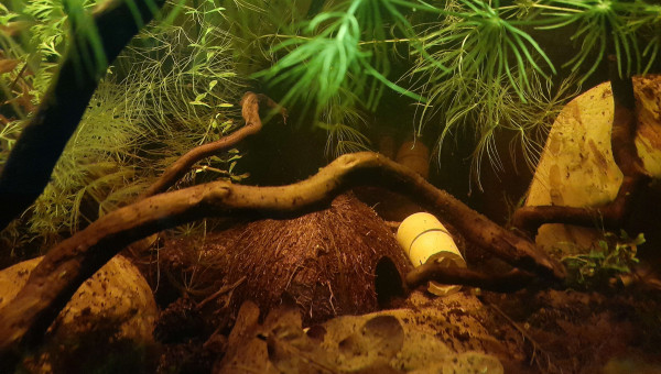 - Ajout 9 fruits d'aulne, 5 feuilles de chène, 1 feuille de catappa + quelques spray de tanin liquide - 1,7L retiré (pour nettoyage filtre + orchidées) - Changement mousse bleu + ouate (mousses complètement saturées, rinçage inutile donc changement par des neuves) - 4L d'eau osmosée ajoutés - Mesure 142µs/cm avant changement d'eau | 136µs/cm après changement - Ajout demi noix de coco + cachette tube céramique