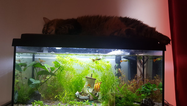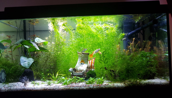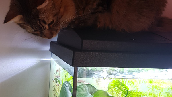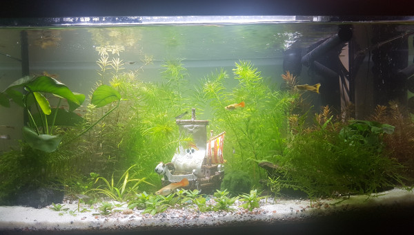Don des 3 guppys adultes et de 15 alevins mercredi le 4 mars. Ils sont maintenant dans un 200L entourés de nouveaux copains dans un aquarium communautaire qui tourne depuis 2017. Retrait de certaines plantes rapides pour 2 plants de ludwigia repens vendredi le 6 mars. Retrait de la boule d'algue marimo "anti-nitrites". Ajout d'une mousse de Taiwan. Les crevettes amano se cachaient depuis leur introduction de mardi, car elles faisaient en majorité moins de 3 cm. Depuis l'introduction de 5 nouvelles crevettes vendredi le 6 mars, elles semblent se mélanger d'avantage au reste de l'aquarium. On les voit se ballader de plante en plante et se reposer dans le bateau. :) Je suis contente, aucun poisson ne se cache à ma vue ni ne semble s'affoler quand je manipule leur environnement. Je vais essayer de les laisser tranquille un moment et juste m'occuper du filtre/nourrisage/taille des plantes rapides. Mais c'est déjà cool de les voir faire leur vie. J'ai l'impression qu'ils vont bien. J'essaierai de leur refaire une plage dans quelques semaines ! :)