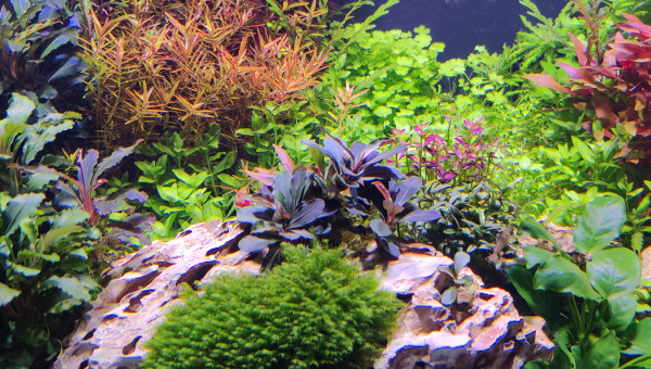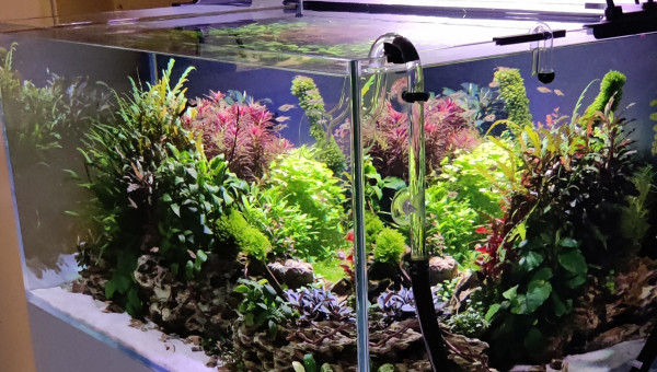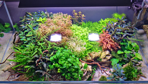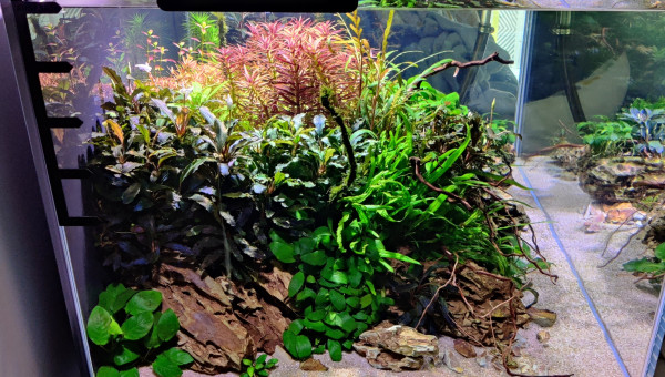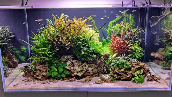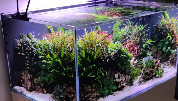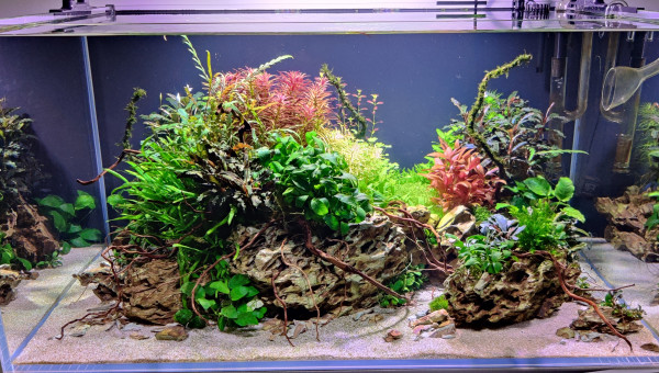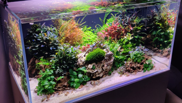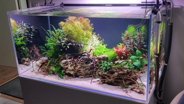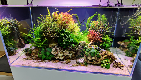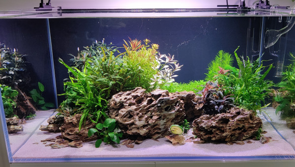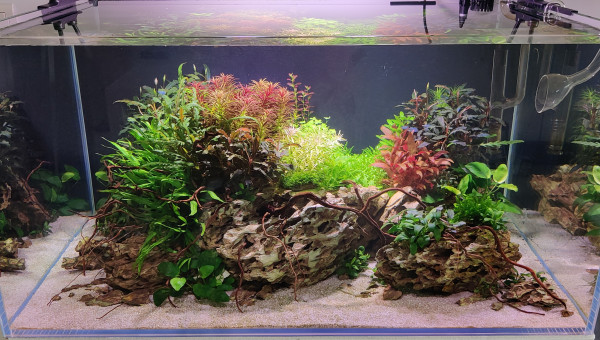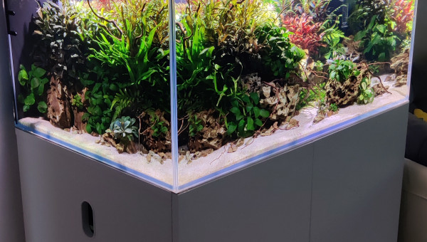 Bac conçu pour un entretien facile. Les épiphytes sont fixées à de petites pierres et peuvent être déplacées ou traitées en cas de problème. Le harscape est entièrement collé à la cyano et contient tout le substrat pour les plantes non épiphytes. Le sable ne se mélange pas au subtrat et peut être changé si besoin.