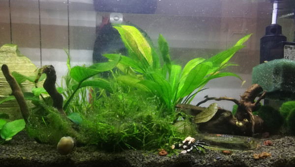 Premier aquarium amateur, rien de très ambitieux. Ce dernier est occupé par des neocaridina (de deux variétés différentes) ainsi que de deux nérites "black racer".