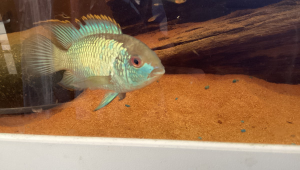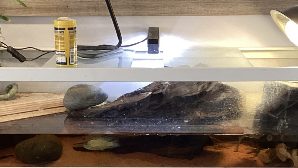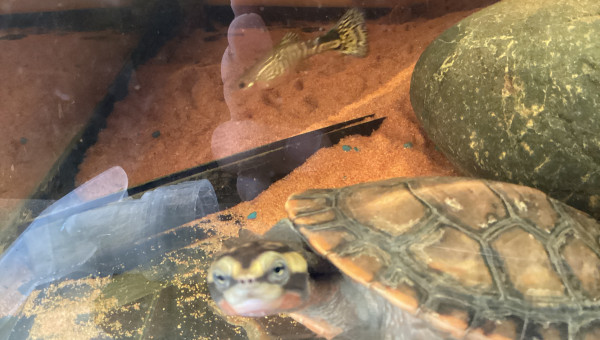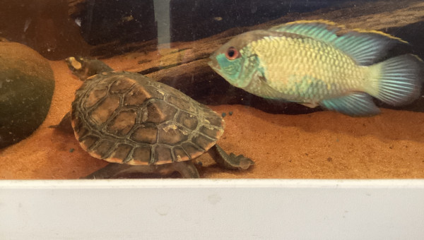 Tortue d’eau douce(Emydura subglobosa) avec guppy endler et un mâle acara bleu électrique L’acara est là temporairement !
