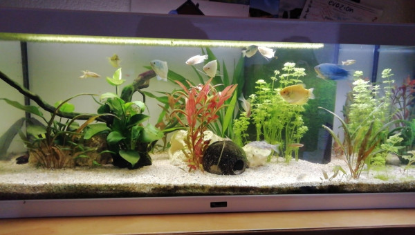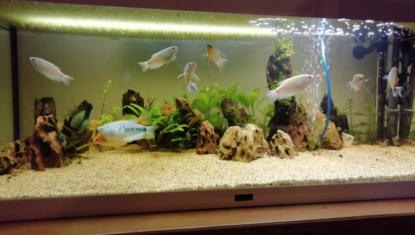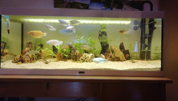 Aquarium de 160 litre, habité par des Botias, des Trichogaster et des Ancistrus.