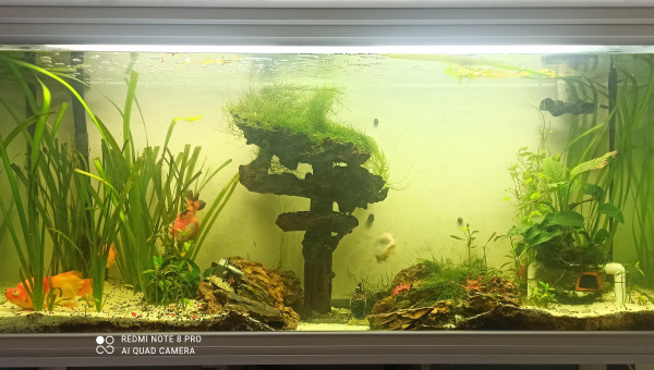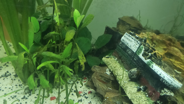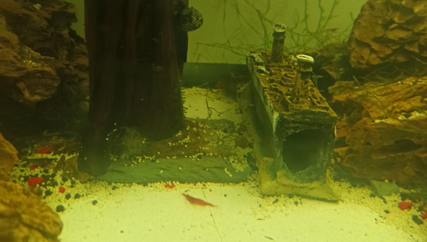 La sculpture centrale à été faite par moi. 6 voiles de Chine différents. 4helena. 17 Neritina en tout genre. Plusieurs crevettes red cherry. , qui nagent tranquillement sans ce faire courser.