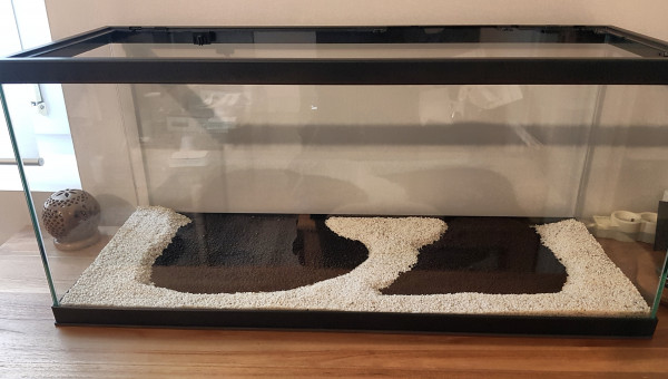 J'ai fini le hardscape une première fois. Les roches ne me plaisaient pas, le bonsaï non plus. J'ai donc tout retiré, mais en faisant cela, le sable et le substrat se sont mélangés. J'ai dû tout trier à la main, relaver et faire sécher le sable pour pouvoir le manipuler