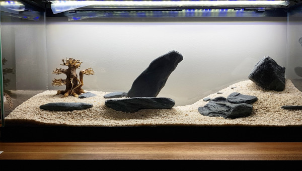 Configuration substrat / sable Je commence à mettre de la hauteur, ajout des premières pierres Je suis coincé pour la partie gauche: pas de pierres similaires aux 1ères (j'ai acheté un pack de roches qui s'avère être nul car il faut des roches de même nature) et pas les formes recherchées... :(