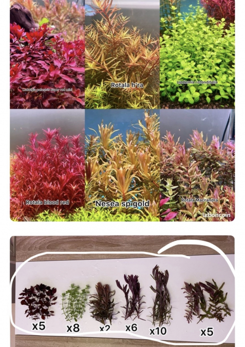 Bonjour, 6 variétés d'aquarium de plantes de coupe disponibles. 10 cm à 14 cm. x5 Ludwigia palustris super red mini x8 Lindernia rotundifolia x2 Nesea sp gold x6 Rotala blood red x10 Rotala h'ra x5 Rotala macrandra green Les portions sont sur la deuxième photo. Toute cette portion ne coûte que 10 €. Merci