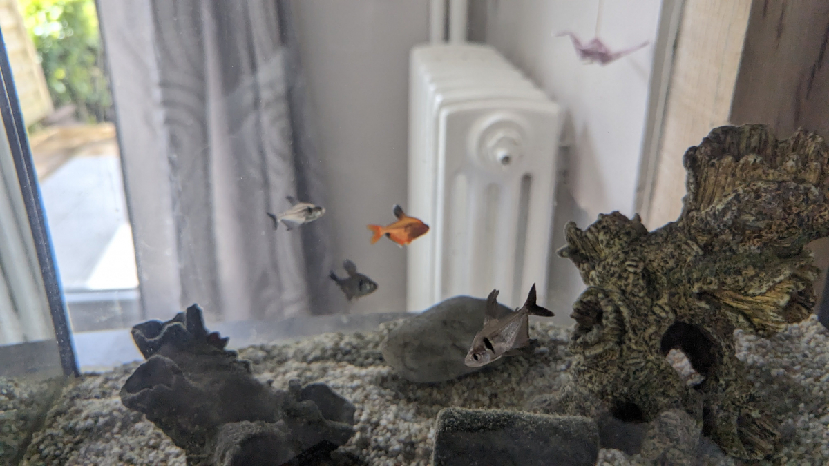 A DONNER - 3 Jeunes Males de Tetra Fantôme Noir, achetés dans une animalerie. J'ai également 1 femelle Tetra Rouge à donner.