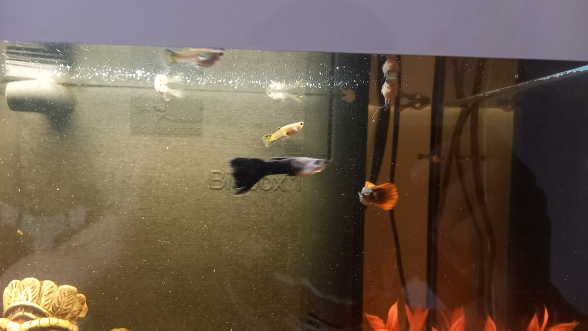 Alevin et guppy, femelle et mâle -Couleur: jaune avec point noir sur la queue Queue et corps noir Orange et noir Donc couleur varier.