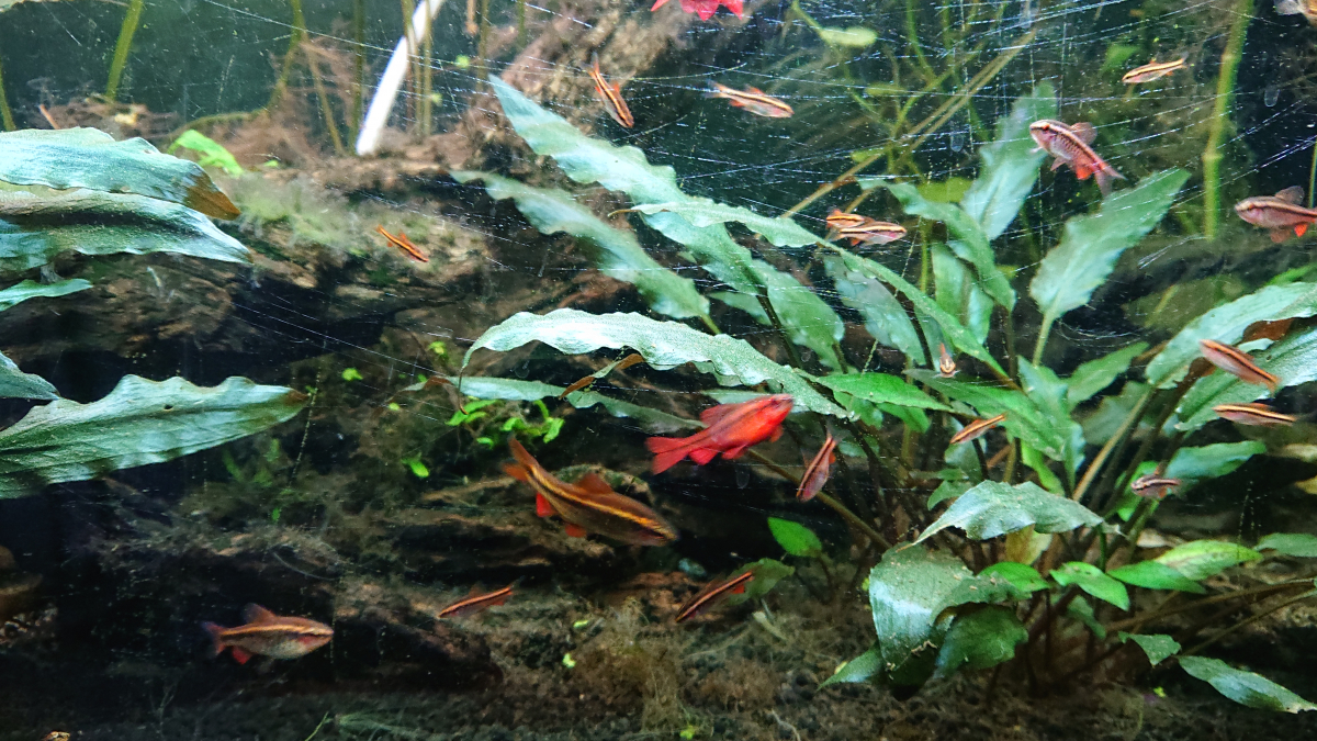 Je vends/échange des alevins barbus cerise, taille entre 1cm et 2cm. Certains commencent à être sexables mais je ne peux rien garantir. Sur la photo on voit également deux adultes.