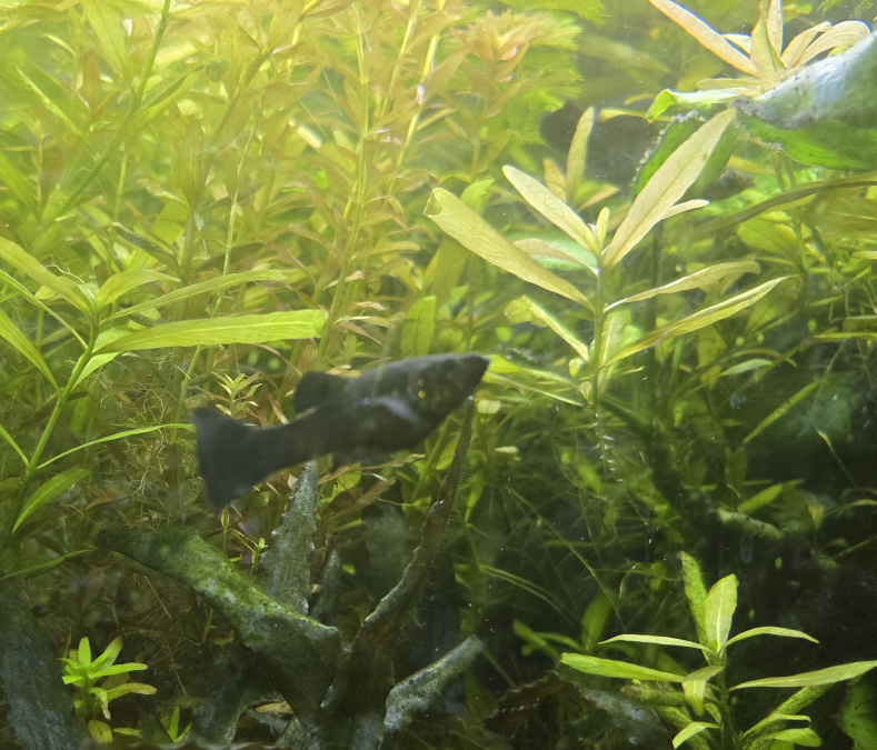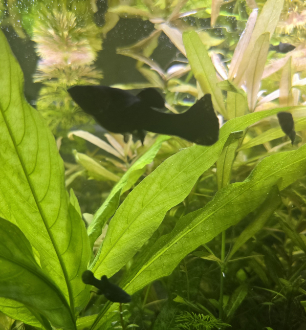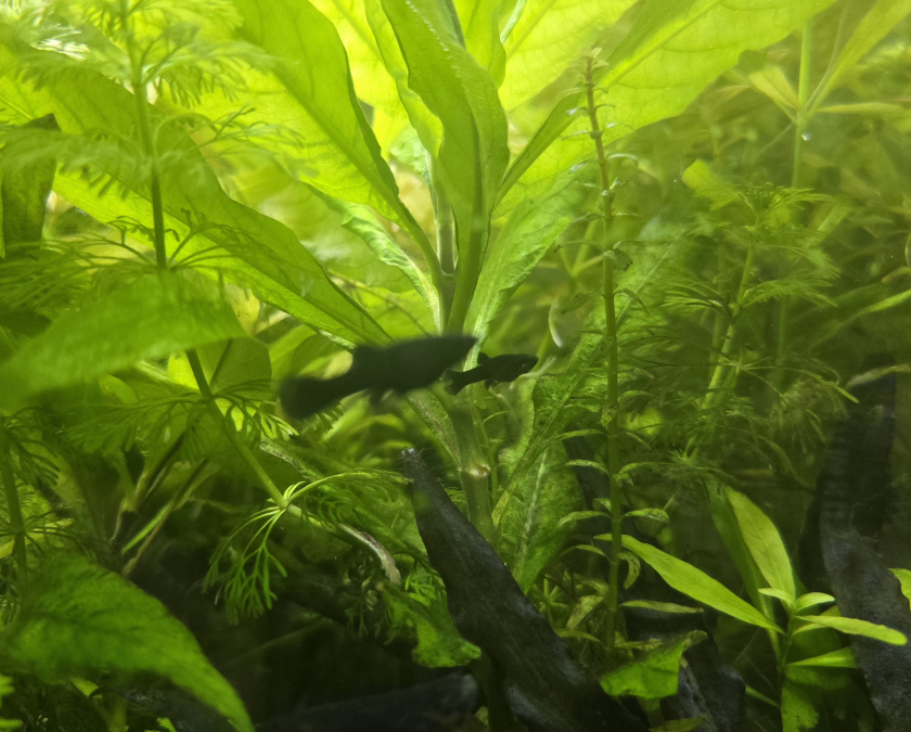 Plusieurs naissances en peu de temps de jolis Platys noirs. Certains ont des reflets orange, sans doute dû à de précédents croisements.