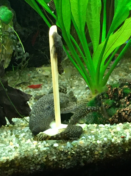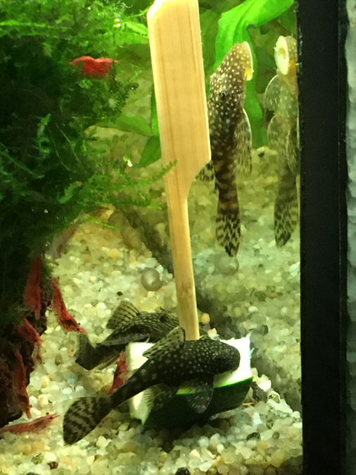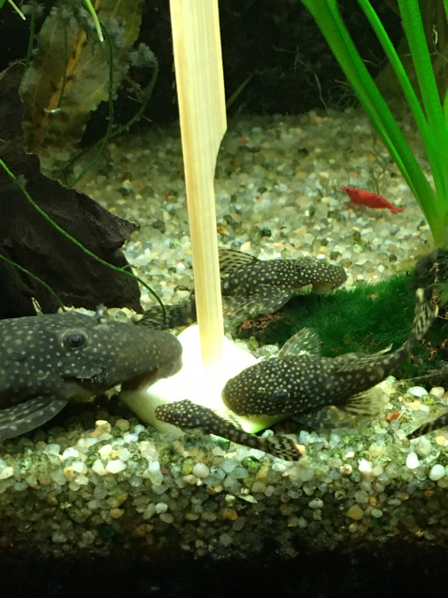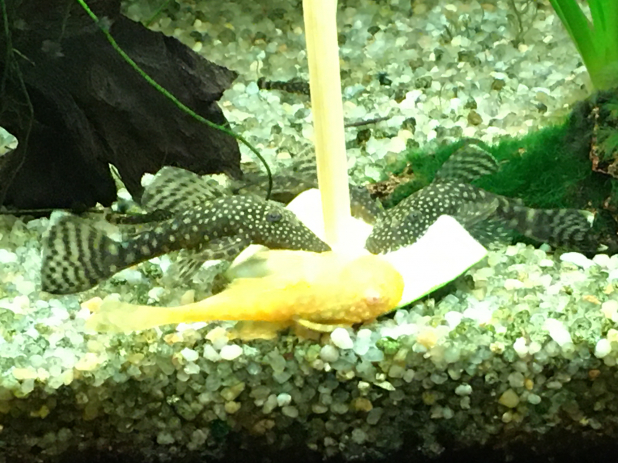 Ancistrus bruns pour la plupart mais quelques gold (2 ou 3) entre 2 et 3 cm environ. Nourris avec comprimés pour poissons de fond et crustacés, spiruline de temps en temps et surtout courgette dont ils sont friands.