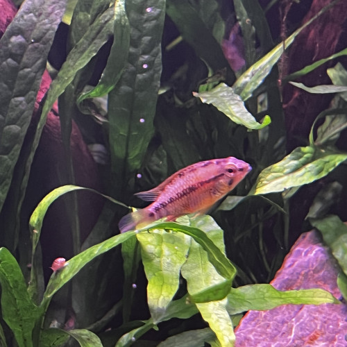 Ayant déjà un couple formé (visibles eux aussi sur les deux dernières photo, je vends une jeune femelle Apistogramma Hongsloi en parfaite santé, ayant grandi dans mon aquarium. Les apistogramma Hongsloi, outre leurs très belles couleurs avec une palette de changements de couleurs particulièrement grande, ont l'avantage de bien supporter comme peu d'apistogramma l'eau calcaire de Paris. Ils nécessitent au moins un aquarium de 60 litres bien planté pour un couple, à 25°degrés. Je ne fais pas d'envoi et vends seulement une femelle, ventes en mains propres à proximité de la BnF.