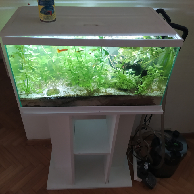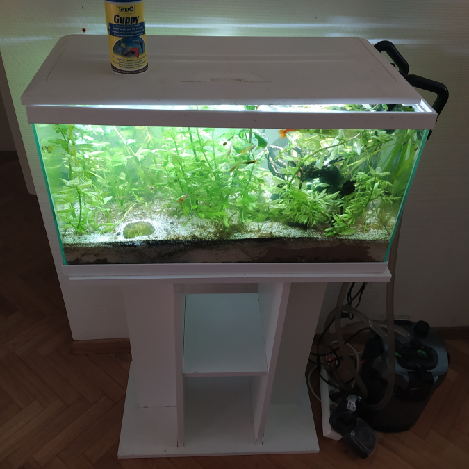 Aquarium avec guppy tout équipé avec pompe externe Tetra 600ex plus sous garantie encore 2ans acheter en juillet 2019 gravier, plante naturelle déco diverses aimant epuisette what nourriture guppy et crevettes produit pour les algues et pour le traitement de l'eau Cause : manque de temps paiement cash et sur place pas de livraison Dimensions : 60x30x33,5 centimètres