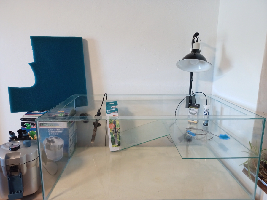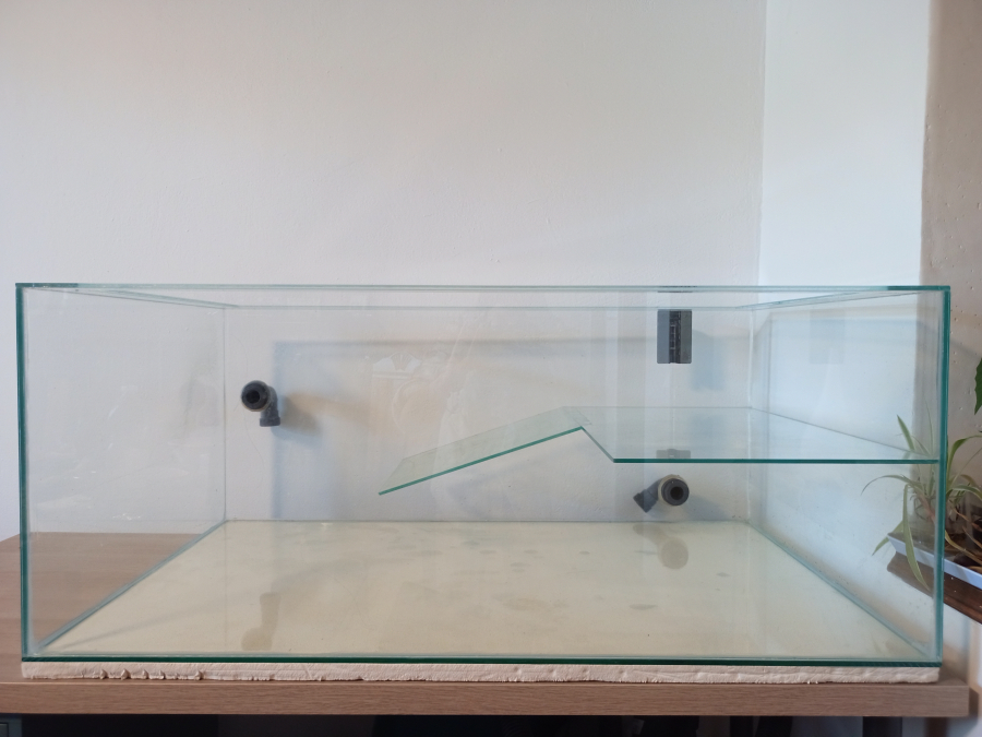 Aqua-terrarium de 1m de long, 60 cm de large et 40cm de haut en verre. Terrasse avec rampe antidérapant. Bord pour éviter que l'animal s'enfuit. Accessoires : - Filtre RS-76 600L/h 2 étages. Manque tuyaux flexibles - Mousse filtrante à découper - chauffage d'eau 100W, abîmé mais fonctionnel. Température précise. - Lampe avec ampoule chauffante 60W E27 UVA. - Aquatest 7en1 ( NO² NO³ GH KH pH CI² CO² ) - Brosse de nettoyage flexible pour tuyaux