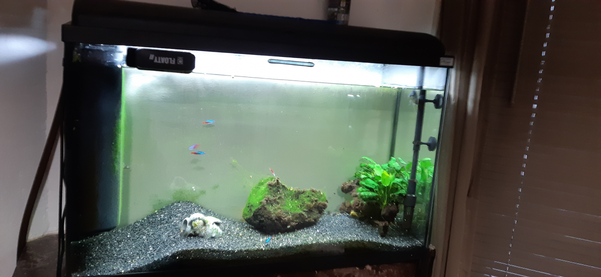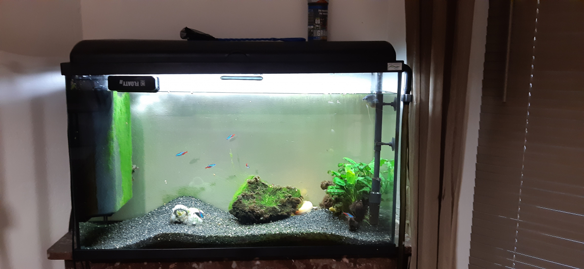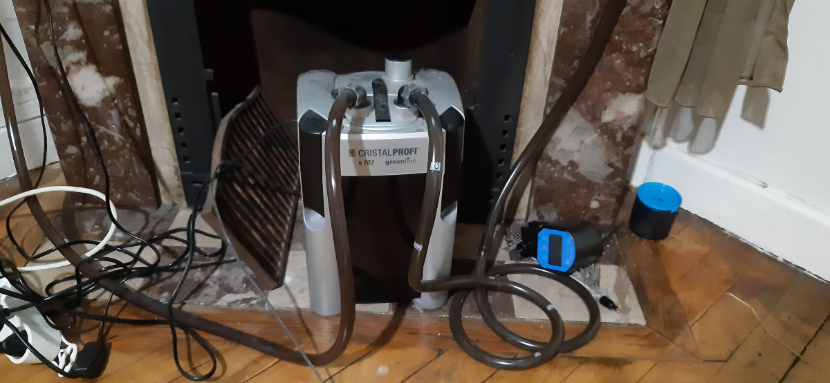 Aquarium Iban noir de 124 litres, marque Aquadisio. Dimensions : L. 80 cm P. 30 cm H. 52 cm Avec éclairage et chauffage de l'eau intégrés Filtre extérieur CristalProfi E702 greeline Distributeur automatique de nourriture pour poissons Pompe nettoyage aquarium Poissons (eau douce) 14 néons bleus 2 nettoyeurs 1 poisson bleu Aménagement Plante Rocher Gravillons L'ensemble est cédé pour cause de déménagement. Pas de livraison, à récupérer sur place. Prix négociable