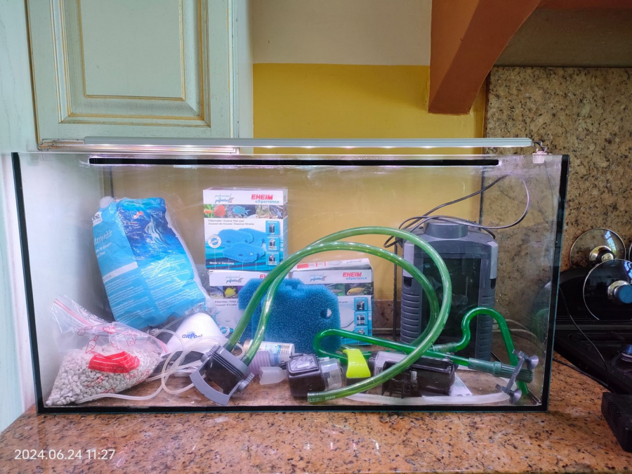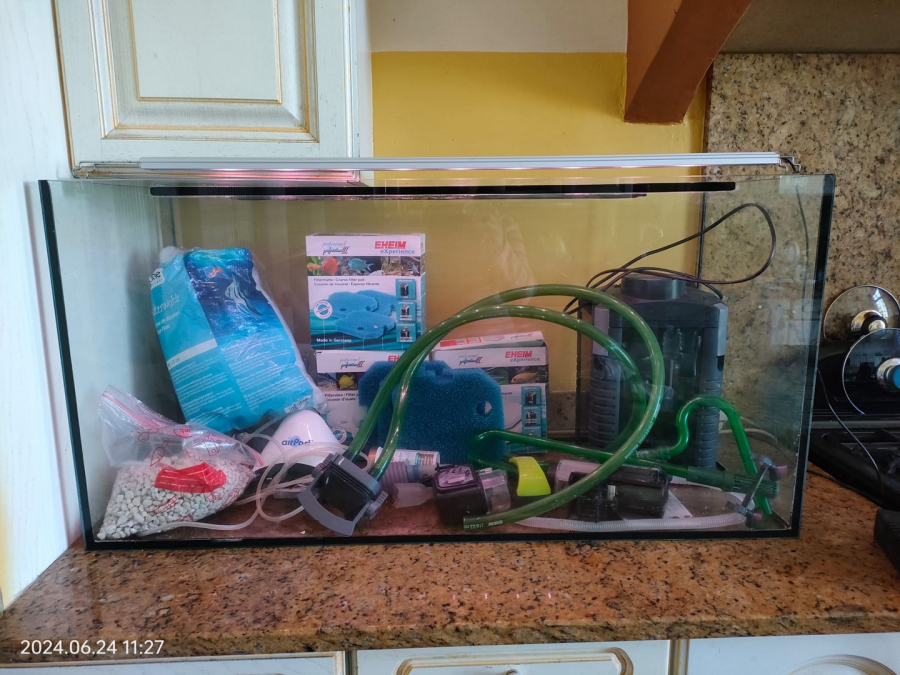 Aquarium 200 Litres en très bon état. Juste un petit impact dans un coin fait lors de l'installation. Nous avons mis du silicone pour ne pas que le coin soit taillant. Il n'a aucun effet sur le bon fonctionnement de l'aquarium. Il peut être caché à l'arrière de l'aquarium (c'est ce qu'on a fait). Dimensions : Longueur100 cm, Largeur 40 cm et Hauteur 50 cm. Avec système lumière installé 53,2 cm de hauteur. Inclus : - moteur silencieux Eheim Filtre Extérieur eXpérience 350 en bon état avec mousses et cailloux pour filtrer et des joints caoutchouc neufs récemment achetés (encore sous emballage). - bulleur à air et pierre à oxygène de marque Airpod en très bon état - JBL AutoFood BLACK Distributeur automatique de nourriture pour poissons d'aquarium avec notice d'utilisation (vendu dans commerce à 55 euros) - Système lumineux ajustable à l'aquarium 2 lumières (une douce et l'autre vive). Le tout prêt à l'emploi. Aquarium à venir récupérer sur Brignemont (31480)