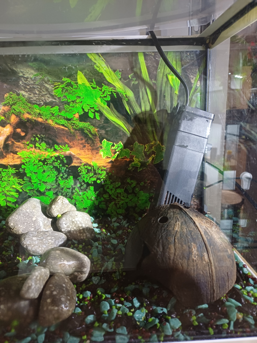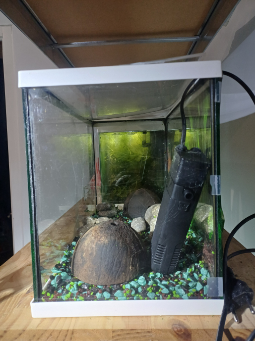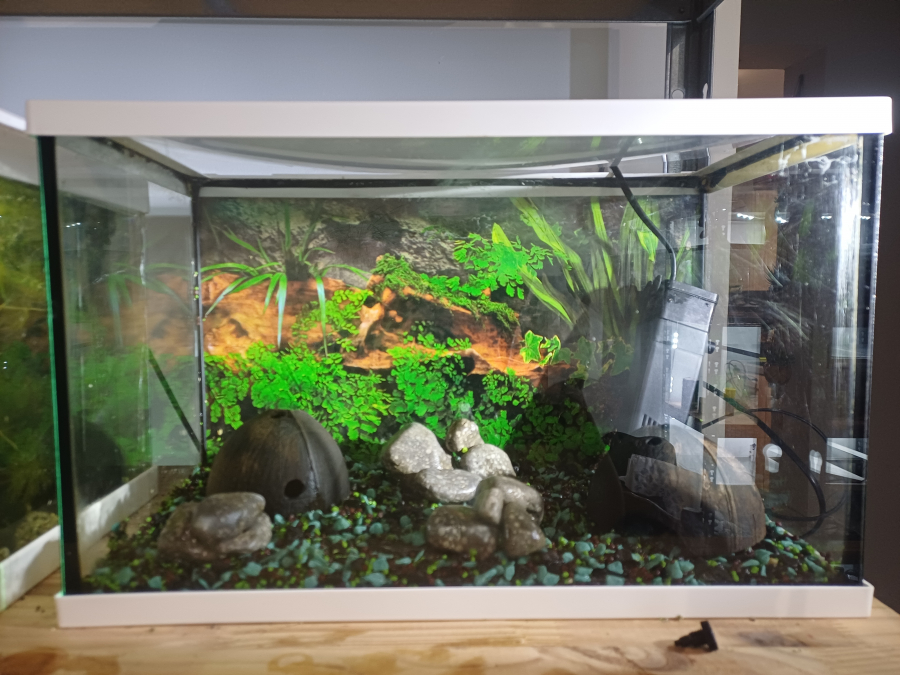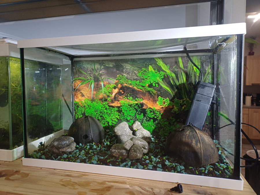 Vend aquarium de 20L équipé d'une pompe, sol en gravier vert, bleu et noir, couvercle en plexiglass, poster de fond, décorations galets gris et noir (bel effet tranchant en eau), 2 noix de coco et coquillages, plantes intégrées (anubia naine et grande, valisneria). Tres bon état, joint impeccables, quelques rayures non visibles en eau. Prix : 45 euros A récupérer sur Vias (34) ou Toulouges (66) ou au long de l'A9 (péage) entre Perpignan et Sète selon déplacements.