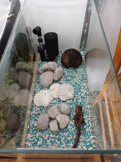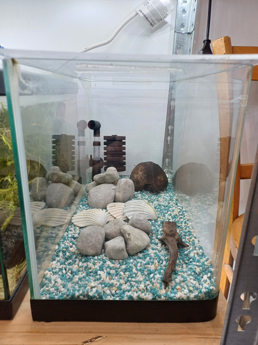 Vend aquarium de 20L équipé d'un exhausteur, avec sol en gravier bleu et blanc, chauffage (non visible mais photo sur demande), couvercle en plexiglass, décorations galets gris et blanc (bel effet en eau), divers coquillages, racine et noix de coco. Ajout de plantes possible, prix sur demande. Excellent état, très peu tourné, quasiment neuf, joints impeccables. Prévoir pompe à air non fournie. Idéal pour élevage de crevettes de couleurs blue velvet, blue saphir, rili carbon, blue jelly, black sakura, white pearl... Prix : 50 euros, négociable si plusieurs bacs achetés voir mes autres annonces A récupérer sur Toulouges (66) ou Vias (34) ou au long de l'A9 (péage) entre Perpignan et Sète selon déplacement.