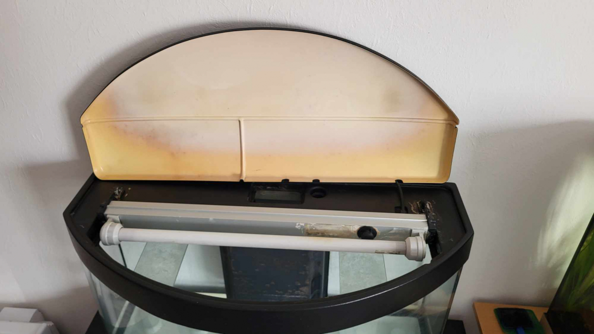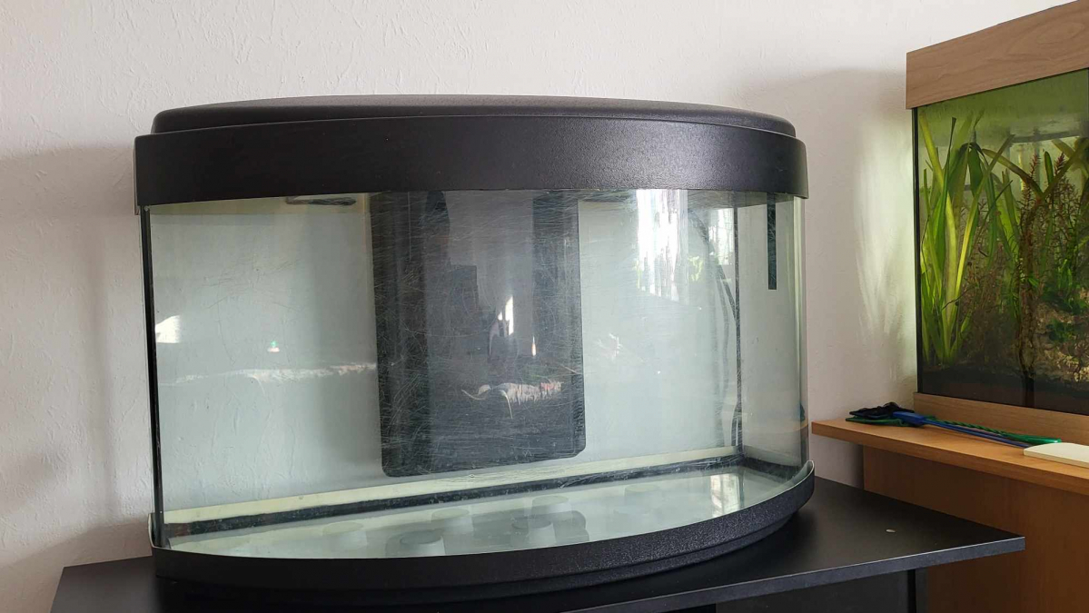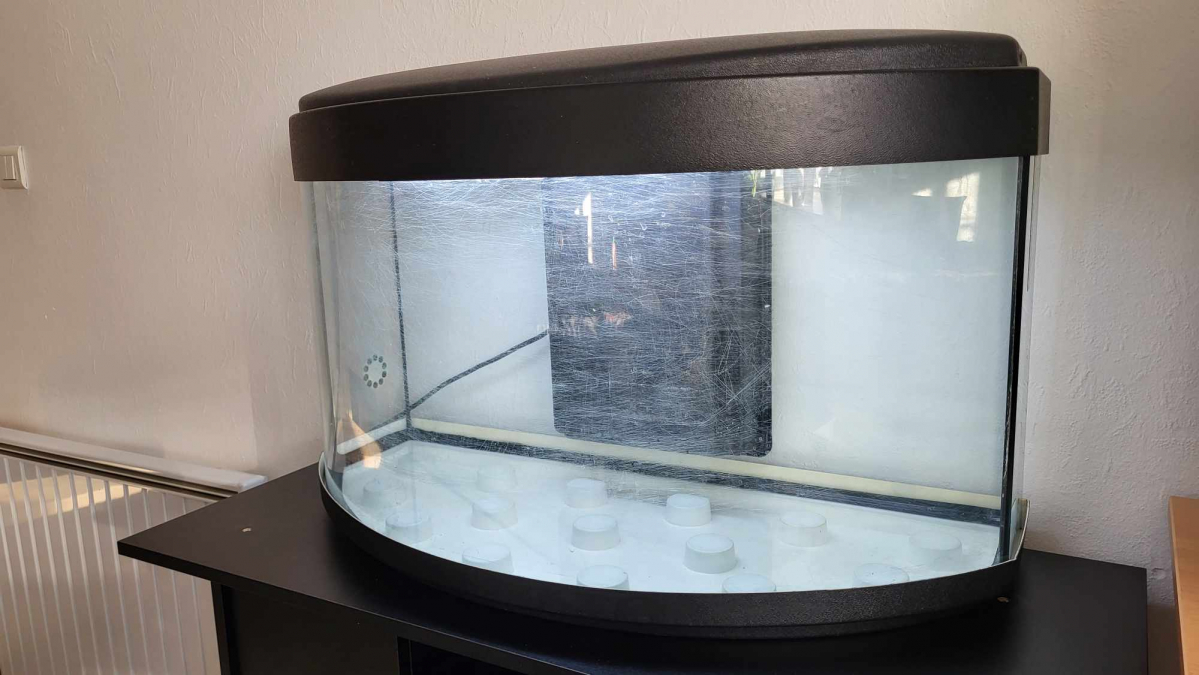 Je vends un aquarium incurvé de 100L avec néon intégré. La vitre est rayée, mais cela ne se voit pas une fois l'aquarium rempli. Il est vendu avec ou sans meuble , le meuble est neuf. Prix sans meuble : 20€. Prix avec meuble : 80€."