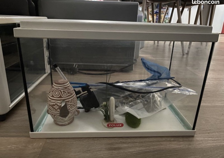 Vend aquarium 20-25L Avec : -une pompe -un distributeur de nourriture automatique -du gravier -Aqua safe ( produit pour traiter l’eau du robinet, il est utilisé mais il en reste énormément) - trois déco (une jarre, une planche de surf et un rocher) - une épuisette