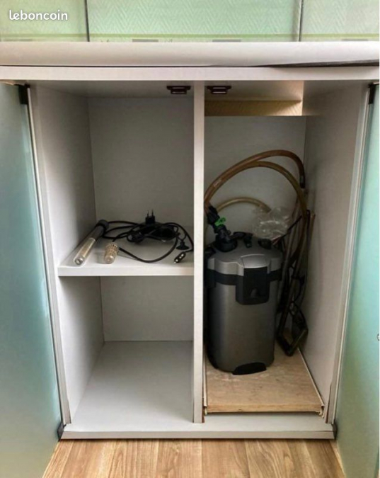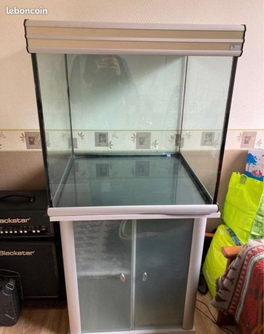 Aquarium Aquatlantis cubique 270 L, avec son meuble et quelques accessoires. Dimensions aquarium : - partie en verre : 65X65 cm - dimensions extérieures totales (avec couvercle et base) : 67,5 x 67,5 x 67,5 cm Dimensions meuble : - h 80,5 x L 67,5 x Pcorps 46 cm (ou P tablette 67,5) Caractéristique : la porte gauche est légèrement ébréchée dans le coin bas droit (cf photo). Possibilité de démonter le meuble pour le transport. Dimensions de l'ensemble (aquarium sur son meuble) : H 147,5 x L 67,5 x P 67,5 cm Accessoires : - chauffe-eau : Aquadisio 261852 - pompe Tetra EX 700 sans matière filtrante Ensemble lourd, à venir chercher sur place uniquement (Massy 91)