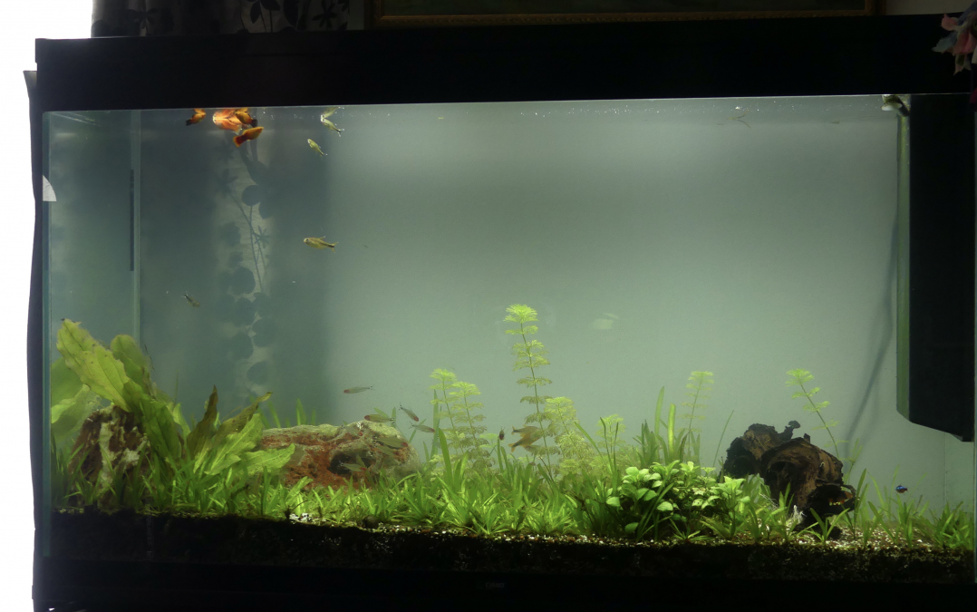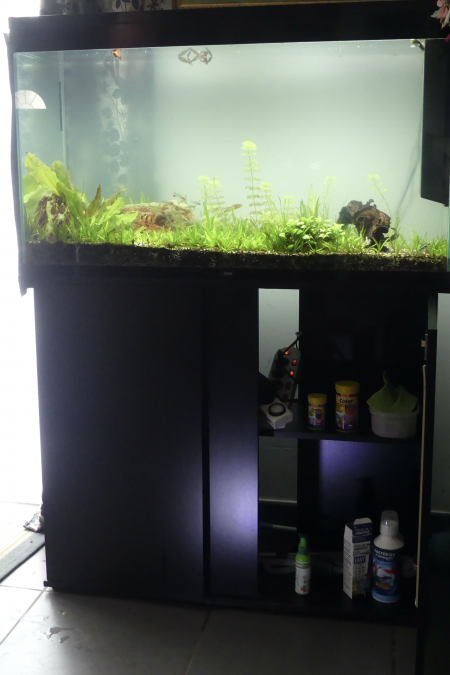 Aquarium 200 L de marque Ciano vendu avec - son meuble 2 portes 1 étagère, - pompe, - rampe d’éclairage à led, - petire épuisette, - pince crabe, - pompe aspirante de nettoyage du fond fonctionnant à piles, - thermomètre. Le fond est composé de substrat pour plantes aquatiques recouvert de couches de graviers. Plantes et décor (cep de vigne flotté, deux pierres) sont 100 % naturels Hauteur totale : 144 cm - largeur 100 cm - profondeur 39 cm Différentes espèces occupent le bassin : ancistrus gold et léopard bande nez rouges platy énorme escargot etc… Nos poissons sont joyeux, aucune agressivité entre eux.