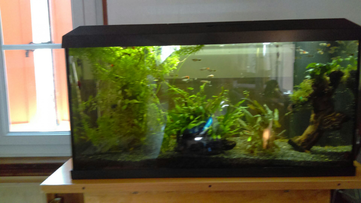 Personne âgée vend aquarium complet avec plantes et guppys. Presque neuf (5 mois). Prix a debattre